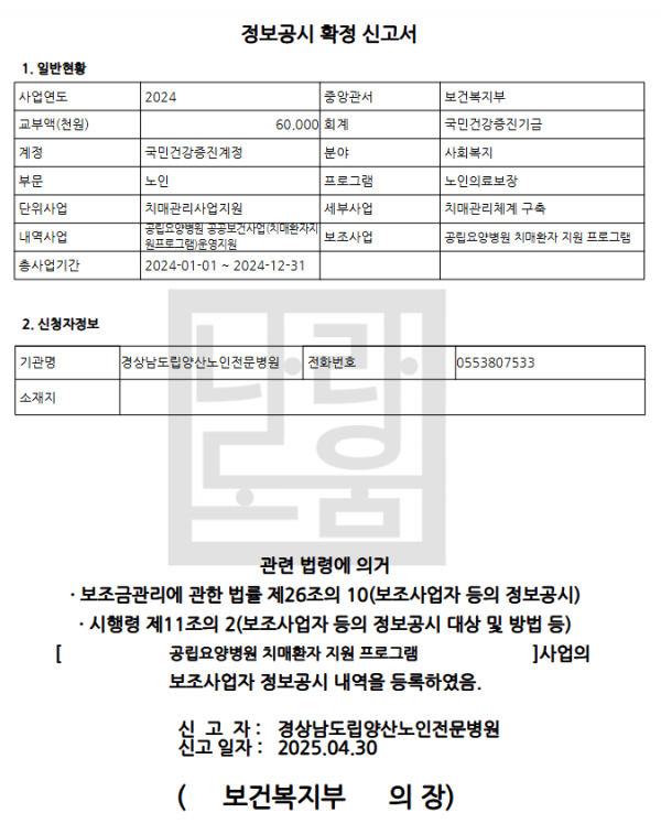 2024년 공립요양병원 공공보건사업(치매환자지원프로그램) 정보공시 확정 알림