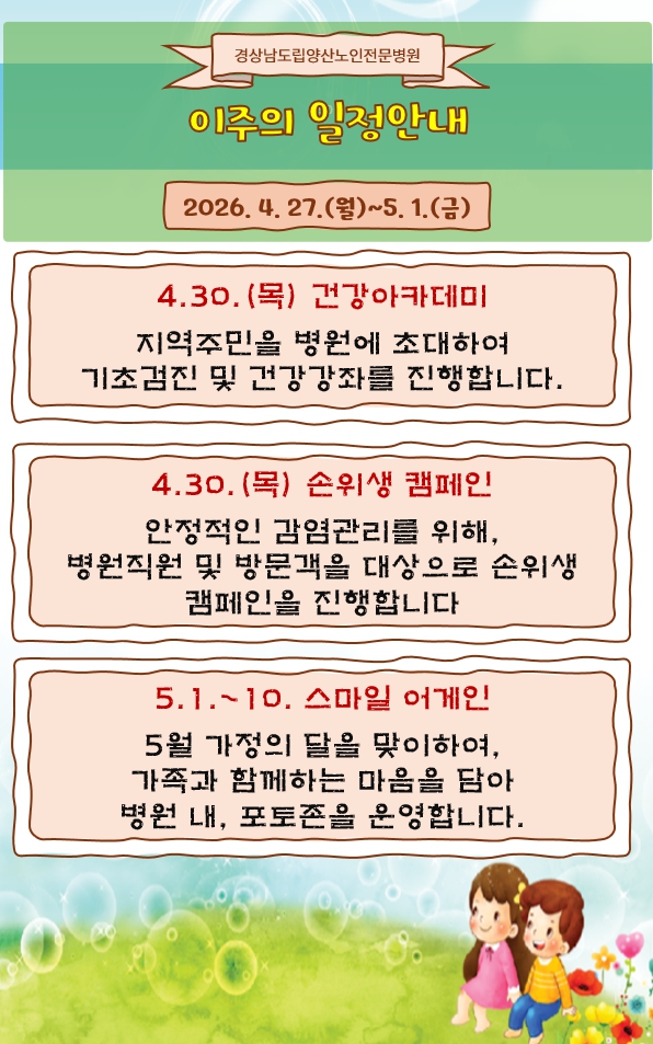 목록 4월 5주 일정안내 페이지 정보 작성자최고관리자 댓글0건 조회9회 작성일26.04.27 09:36 본문 4월 5주 일정안내 이전글환자안전·감염관리 캠페인을 실시합니다. 26.04.30 다음글공립요양병원 공공사업지원(치매환자 지원프로그램) 사업안내 26.04.23 댓글 0 댓글목록 등록된 댓글이 없습니다.