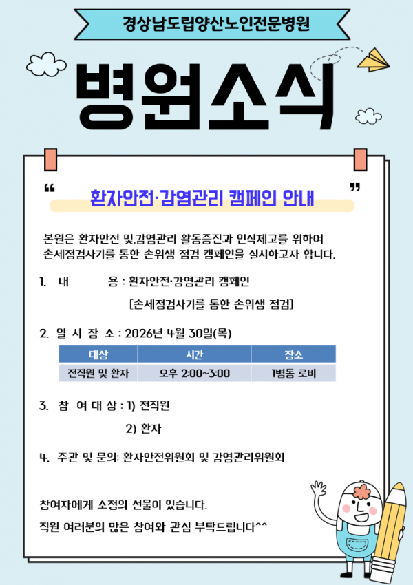 목록 환자안전·감염관리 캠페인을 실시합니다. 페이지 정보 작성자최고관리자 댓글0건 조회4회 작성일26.04.30 11:26 본문 환자안전·감염관리 캠페인 다음글4월 5주 일정안내 26.04.27 댓글 0 댓글목록 등록된 댓글이 없습니다.