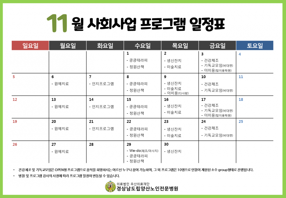 목록 [11월 프로그램 일정표] 페이지 정보 작성자관리자 댓글0 조회738 작성일23.10.31 00:00 본문 이전글상하북종합사회복지관 업무 협약식 23.11.14 다음글[10월 프로그램 일정표] 23.09.25 Comment 0 댓글목록 등록된 댓글이 없습니다.