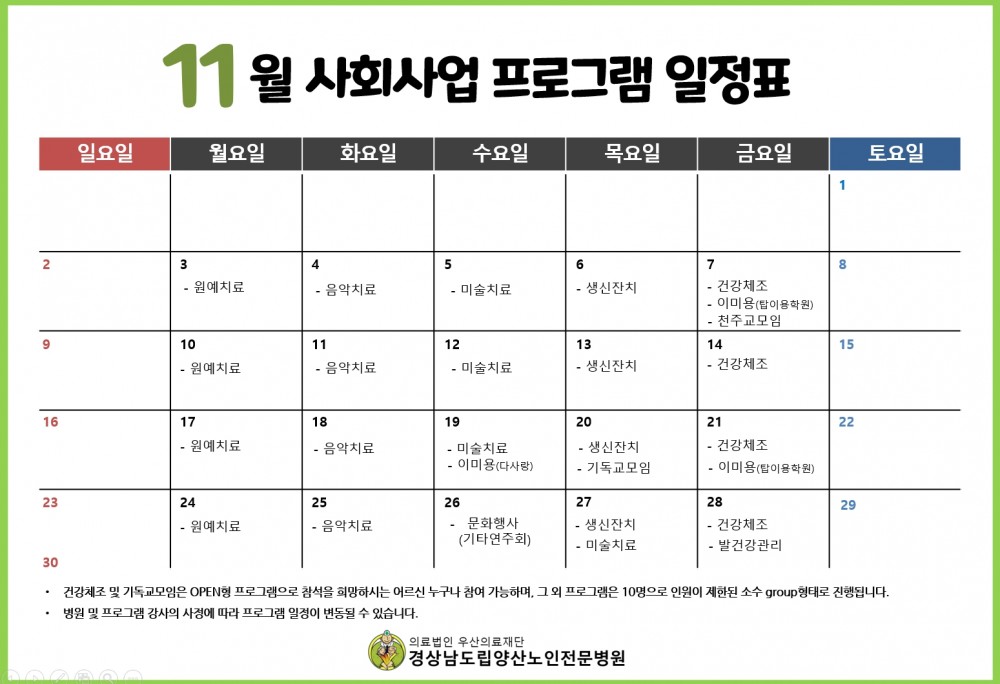 목록 11월 프로그램 일정표 페이지 정보 작성자최고관리자 댓글0 조회72 작성일25.11.26 11:11 본문 11월 프로그램 일정표 이전글12월 프로그램 일정표 25.11.28 다음글10월 프로그램 일정표 25.10.24 Comment 0 댓글목록 등록된 댓글이 없습니다.