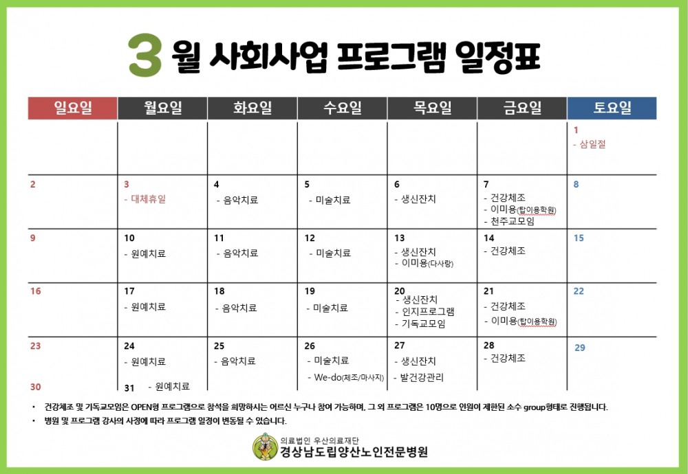 목록 3월 프로그램 일정표 페이지 정보 작성자최고관리자 댓글0 조회219 작성일25.02.27 15:44 본문 3월 프로그램 일정표 이전글4월 프로그램 일정표 25.04.03 다음글2월 프로그램 일정표 25.02.04 Comment 0 댓글목록 등록된 댓글이 없습니다.